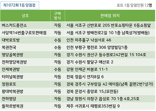 로또 1등 2등 당첨자 나온 전국 복권 판매점에 대한 정보가 제공 됩니다.