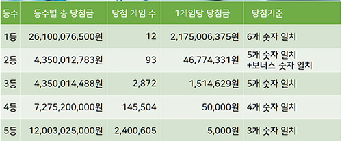 당첨 등수별로 총당첨금, 당첨 복권 게임수, 복권 1개당 당첨금, 등수별 당첨기준을 알 수 있습니다.