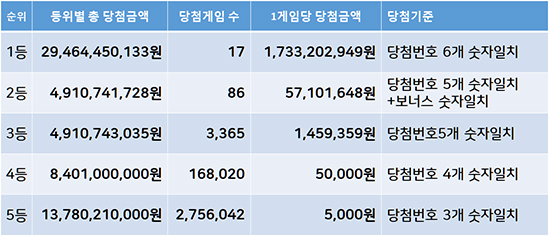 로또 당첨 로또645 복권 등수별 당첨금, 로또당첨 인원수(게임수), 당첨 등수 당첨금액, 당첨기준 등은 다음 집계표에 잘 표시되어 있습니다.