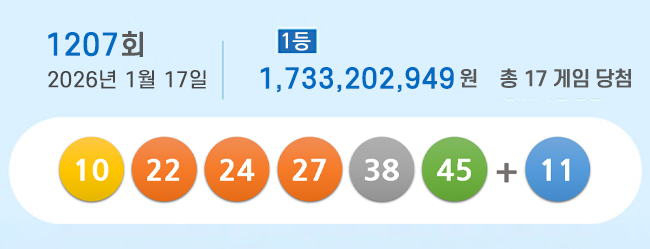1208회 로또 당첨 번호 추첨, 로또 1207회 1등 17억 3천만원씩 17명 전국 로또 1등 2등 당첨지역 전체 공개. 오늘 로또 1등 당첨번호 10, 22, 24, 27, 38, 45번, 보너스 번호 11번 당첨, 로또 1등 예상번호 무료 추출하는 로또 복권 1등 2등 당첨 로또명당 유명 복권 판매점! 모두 공개!
