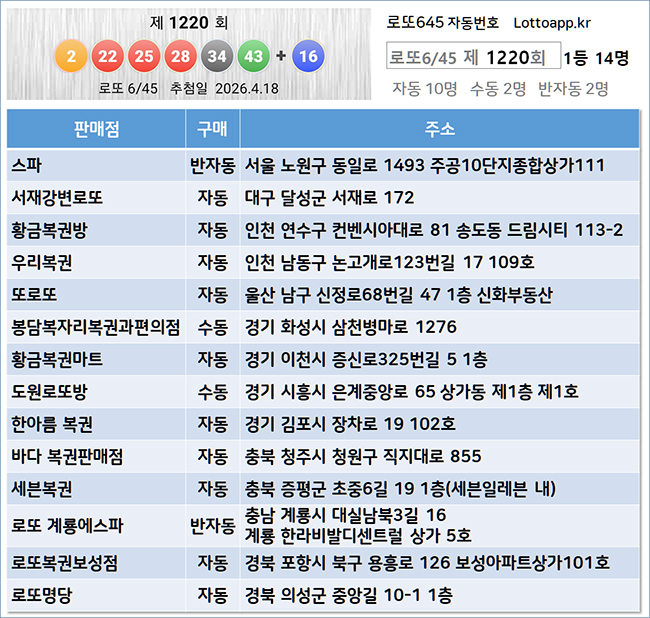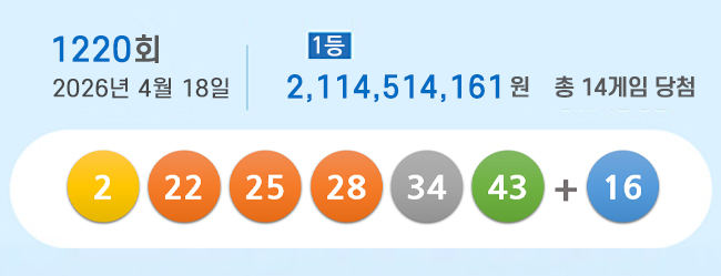 1221회 로또 당첨 번호 추첨, 로또 1220회 1등 21억 1천만원씩 14명 전국 로또 1등 2등 당첨지역 전체 공개. 오늘 로또 1등 당첨번호 2, 22, 25, 28, 34, 43번, 보너스 번호 16번 당첨, 로또 1등 예상번호 무료 추출하는 로또 복권 1등 2등 당첨 로또명당 유명 복권 판매점! 모두 공개!