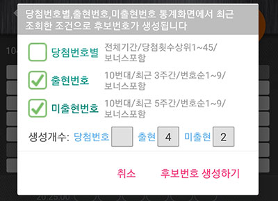 로또번호 생성화면에서 후보번호 생성을 누르면 유형별로 생성개수 비율을 지정하는창이 나오는데 지금은 출현번호, 미출현번호 체크하고, 출현 4개, 미출현 2개를 입력하였습니다.