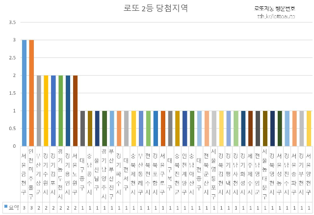 시구군 지역별로는 서울 금천구 3명, 인천 미추홀구 3명, 부산 기장군 2명, 경기 수원시 2명, 경기 김포시 2명, 경기 동두천시 2명, 경기 용인시 2명, 서울 노원구 2명 등이 최다 당첨지역으로 확인 되었습니다.