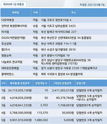 966회 로또1등 총당첨금은 약 241억원, 1등 당첨자 10명은 1인당 약 24억 1천만원씩 당첨금 지급 됩니다.