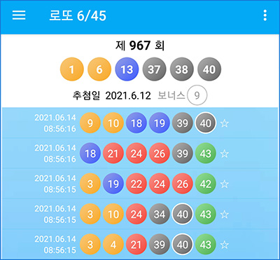 오늘의 운세에서 추천한 행운번호를 이용하여 968회 로또 예상번호를 로또645앱으로 최종 로또번호 받아 보세요.