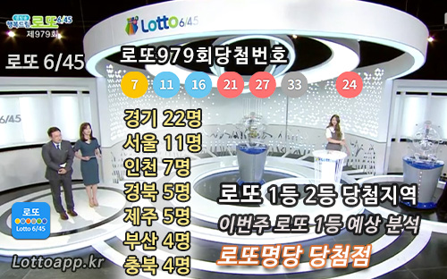 로또 6/45 제979회 1등 2등 당첨지역 로또명당 1등 스파 2명, 경기 22명, 서울 11명 최다 2등 배출 지역, 인터넷복권사이트 당첨, 제주시 5명, 고양시 5명 최고 로또당첨 로또980회 예상번호 스파 탐방