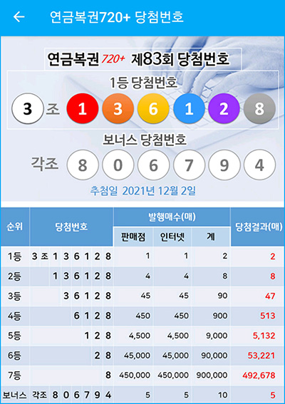 연금복권 720+ 84회 당첨번호 예측에 12월 2일 추첨된 83회 연금복권 당첨 추첨결과 1등 2매, 2등 8매, 보너스 5매로 좋은 당첨 실적 분석하여 84회 예상번호 찾아 봅니다.