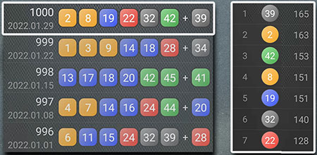 지난 1000회 로또당첨번호는 32번, 42번, 39번이 직전 5주 출현번호에서 나왔죠.