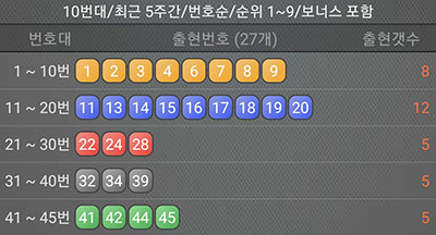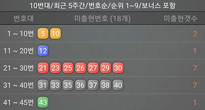 나머지 번호는 5주 미출현 번호와 일치한 것으로 파악 됩니다.