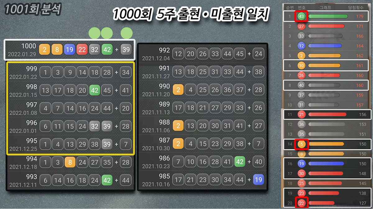 5주 미출현에서 2번, 8번이 일치하였구요, 10주 미출현에서 19번이 일치하였고, 15주 미출현에서 22번이 일치한 것으로 파악됩니다.