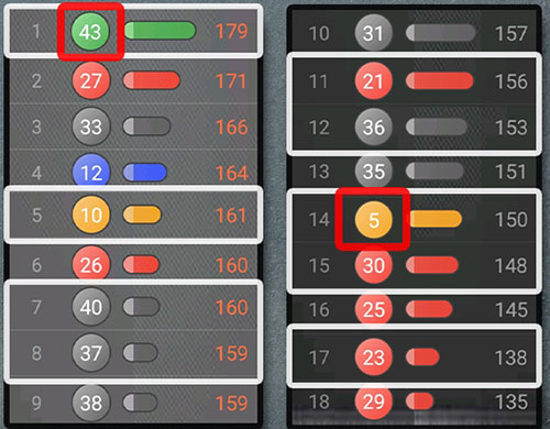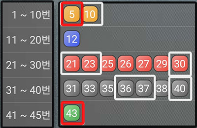 15주 미출현 번호는 빨강색으로 2개입니다. 43번, 5번 후보수에서 43번이 행운번호로 가능합니다.