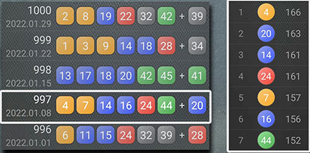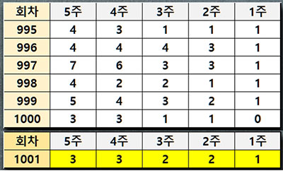 로또복권 기간별 출현 갯수 흐름에서 1주차 1000회, 2주차 999회, 4주차 997회에서 각 1개 번호씩 선택하는게 좋다는 분석입니다.
