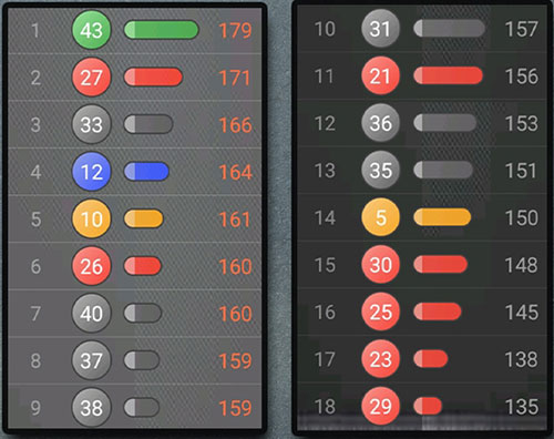 빨강색은 15주간 미출현 번호, 흰색은 10주간 미출현, 나머지는 5주 미출현 번호 입니다.