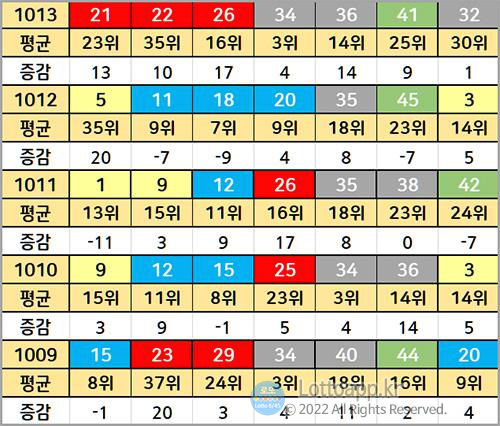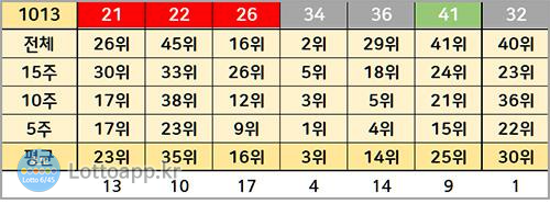 1013회 당첨번호 중에서는 26번이 상승폭이 가장 많아서 17위 상승 하였습니다.
