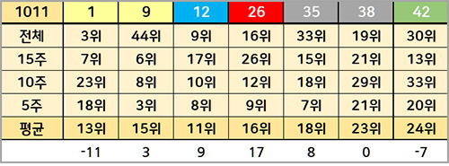 1011회 로또 당첨 번호는 26번이 17위 상승하였고, 1번은 11위 하락 했습니다.