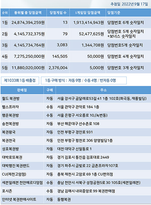 로또 1034회 예상번호 로또분석 1033회 1등 13명 2등 79명 당첨지역 로또명당 자동 9명 수동 4명 로또 당첨 예측 번호