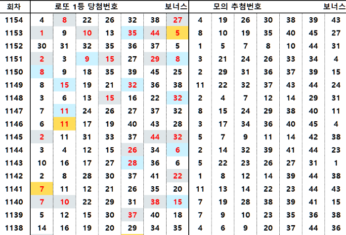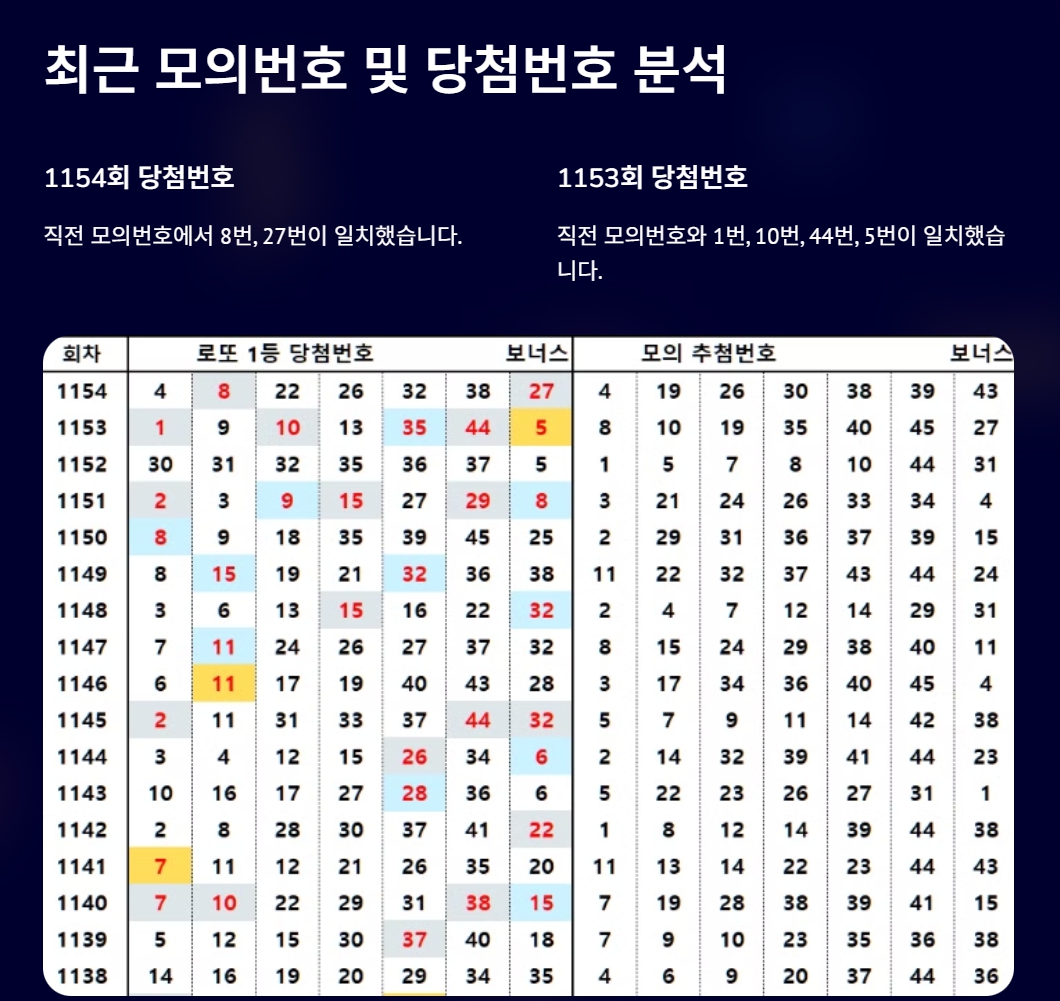 1154회차 당첨번호는 직전 1153회차 모의번호에서 8번 27번이 나왔습니다. 그리고, 1153회차 당첨번호는 직전 1152회차 1등 당첨번호와 35번 5번이 일치했고, 모의번호와는 1번 10번 44번 5번이 일치했습니다.