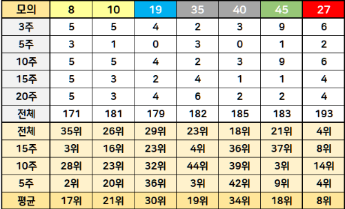 반대로 평균 순위 하위권은 제외수로 사용하시길 바랍니다. 하위 3개는 예상번호에 포함되지 않도록 미리 빼는 것입니다.