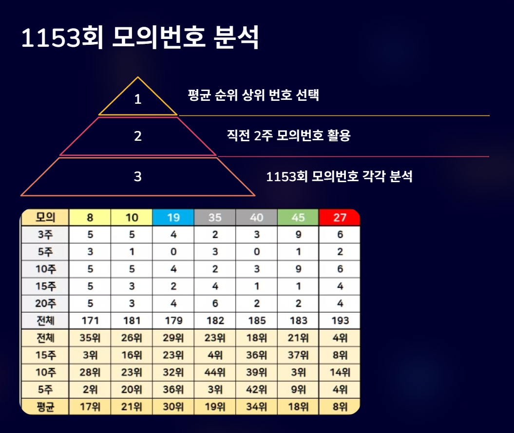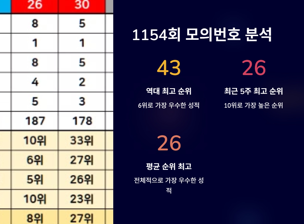 1154회 1153회 모의 추첨번호 분석표를 참고하여 1155회 로또 당첨번호를 예측해 보시길 바랍니다.