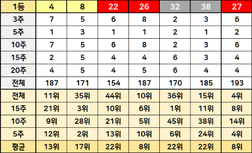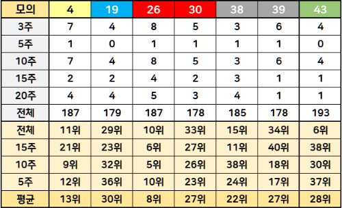 역대 당첨 순위로는 43번이 6위를 차지하며 가장 우수하고, 5주간으로 볼 때는 26번이 10위로 가장 높습니다. 평균 순위를 보면 역시 26번이 가장 우수하네요.
