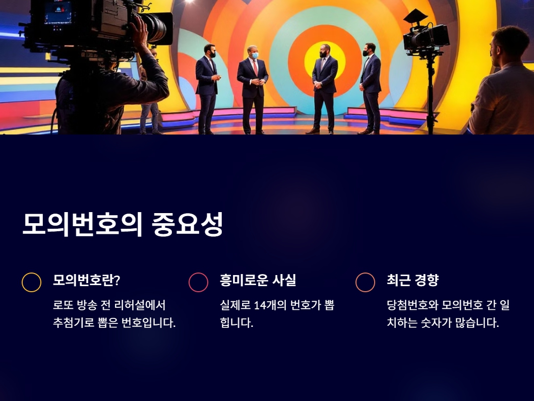 모의번호는 로또추첨 방송에서 로또 1등 번호를 발표하기 전에 리허설을 거치는데 이때 추첨기를 동작시켜서 점검하게 됩니다. 이 과정에서 확인된 번호가 모의 추첨번호입니다. 사실 로또 번호 발표에서 7개 번호가 이닌 총 14개 번호가 뽑히고 있다는 것이 흥미로운 사실입니다.