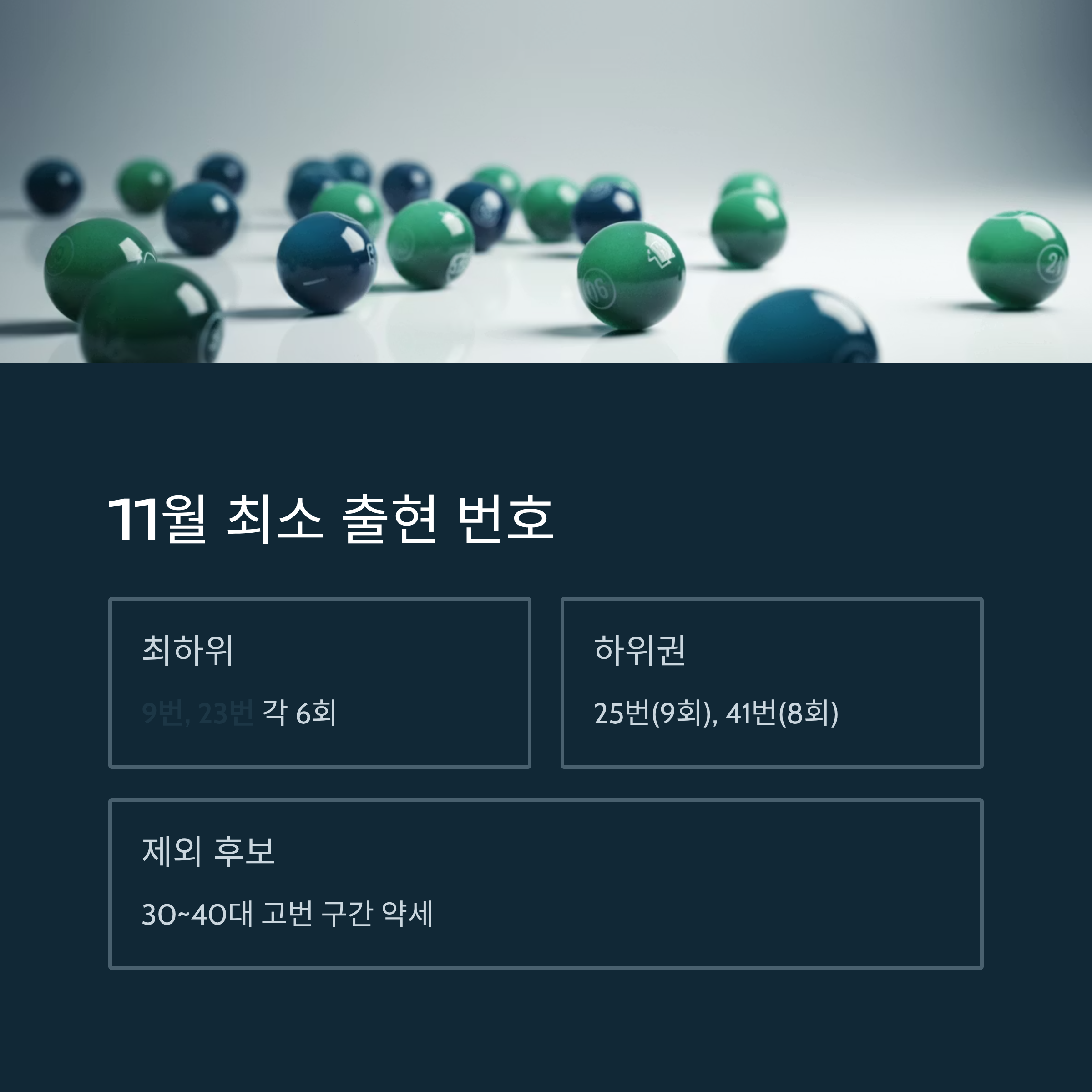 이 번호들은 11월 통계에서 10~11회 출현으로 평균에 크게 못 미칩니다. 특히 30~40대 고번 구간이 11월에 약하다는 점을 감안하면, 이 번호들을 제외하는 것이 전략적으로 유리합니다.