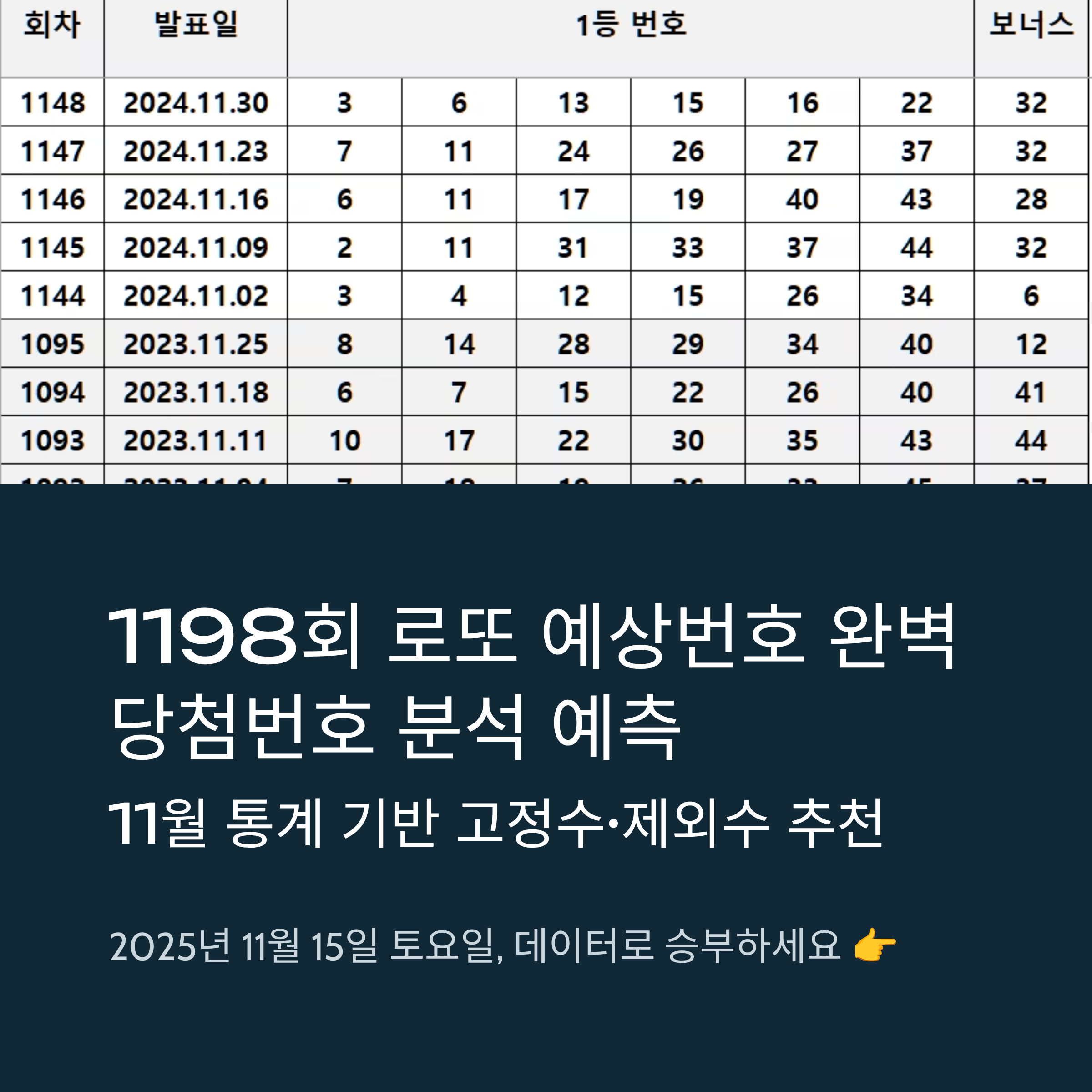 1198회 로또 예상번호 완벽 당첨번호 분석 예측 : 11월 역대 통계 적용 고정수 제외수 추천, 왜 11월 통계 중요할까?