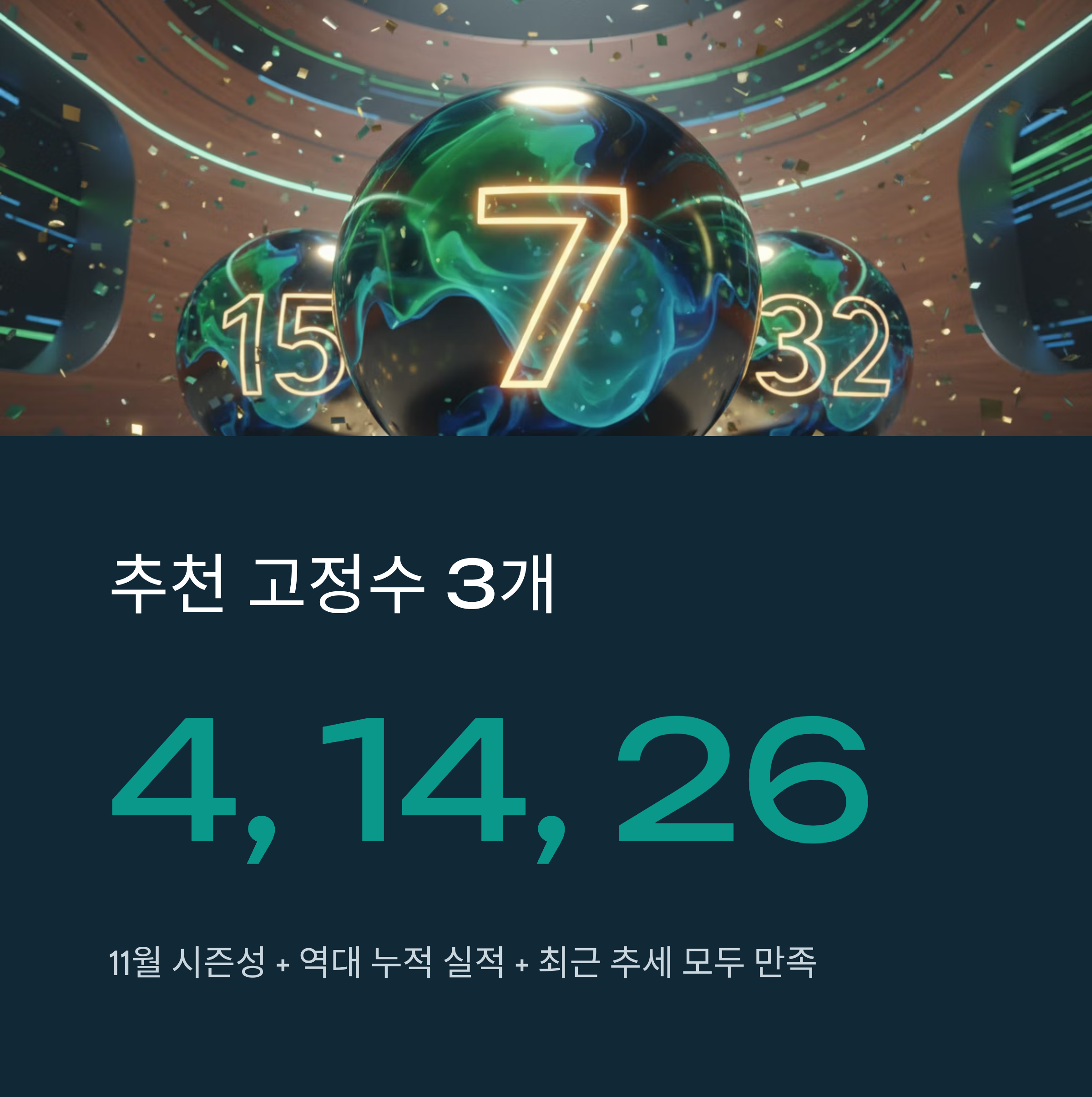 이 세 개 번호는 11월 시즌성 + 역대 누적 실적 + 최근 추세를 모두 만족하는 번호들입니다. 로또번호 자동생성 앱에 4, 14, 26을 고정수로 입력하고, 나머지 3개는 자동으로 생성하면 됩니다!