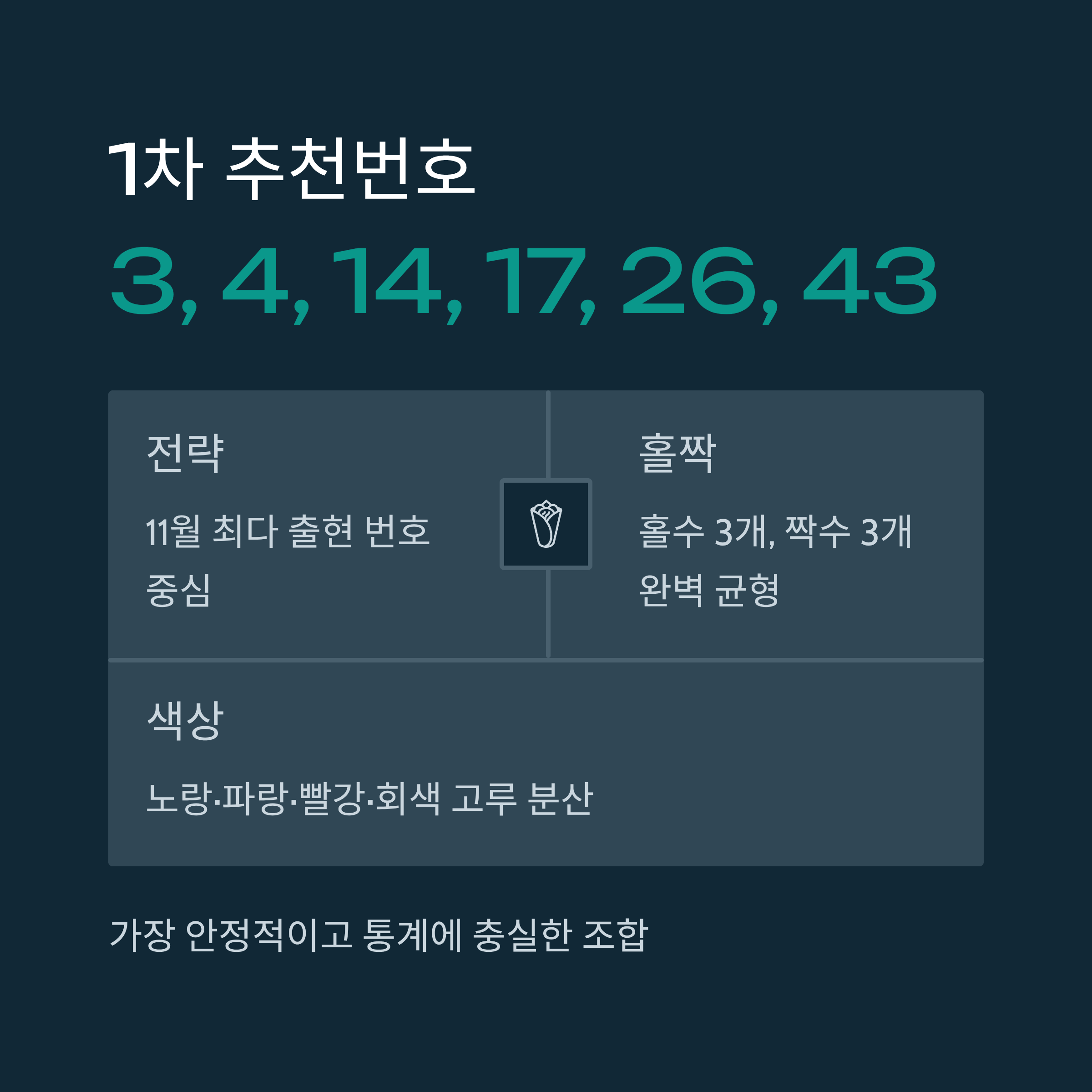 - 3, 4, 14, 17, 26, 43 - 11월 강세 + 이월수 조합