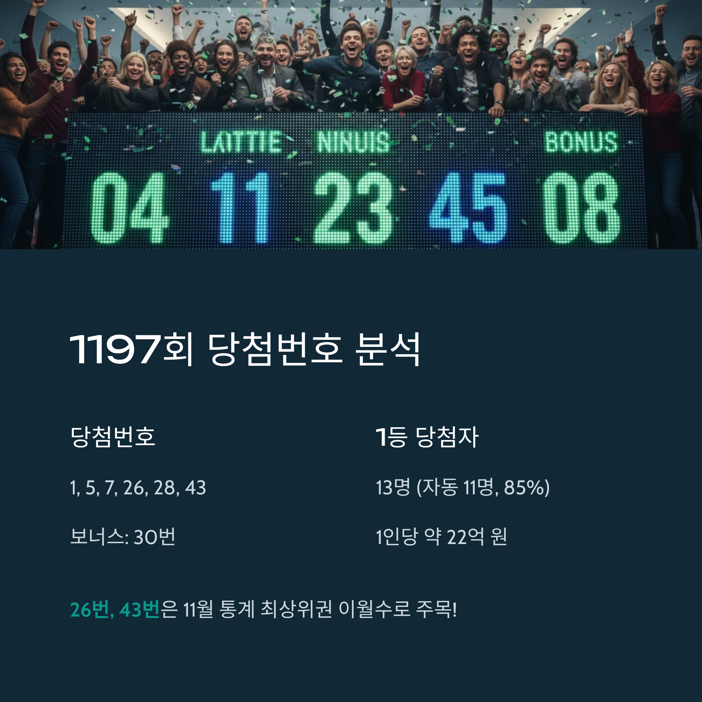 지난주 1197회 당첨번호는 1, 5, 7, 26, 28, 43 + 보너스 30번이었습니다. 13명의 1등 당첨자가 탄생했고, 그 중 11명(85%)이 자동 구매였다는 점이 눈에 띕니다. 1인당 당첨금은 약 22억 원!