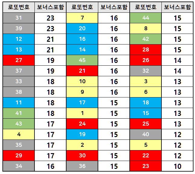 아래 12월 집계표를 참고하세요. 제가 조사한 역대 12월 가장 많이 출현한 순서로 나열한 자료입니다. 보너스 포함된 집계이구요.