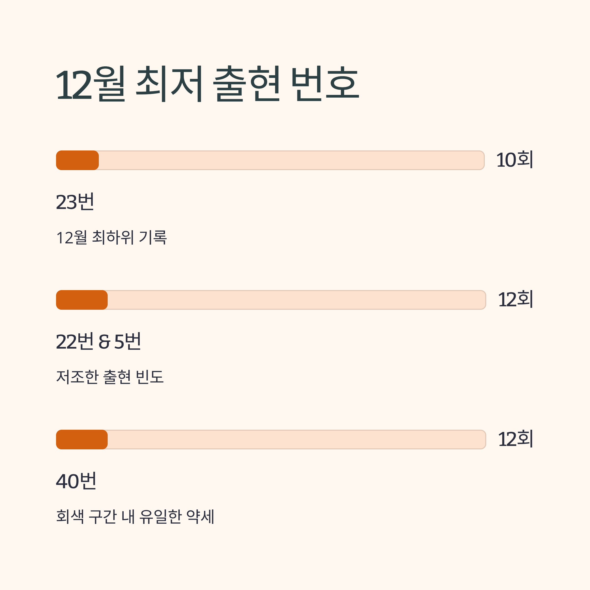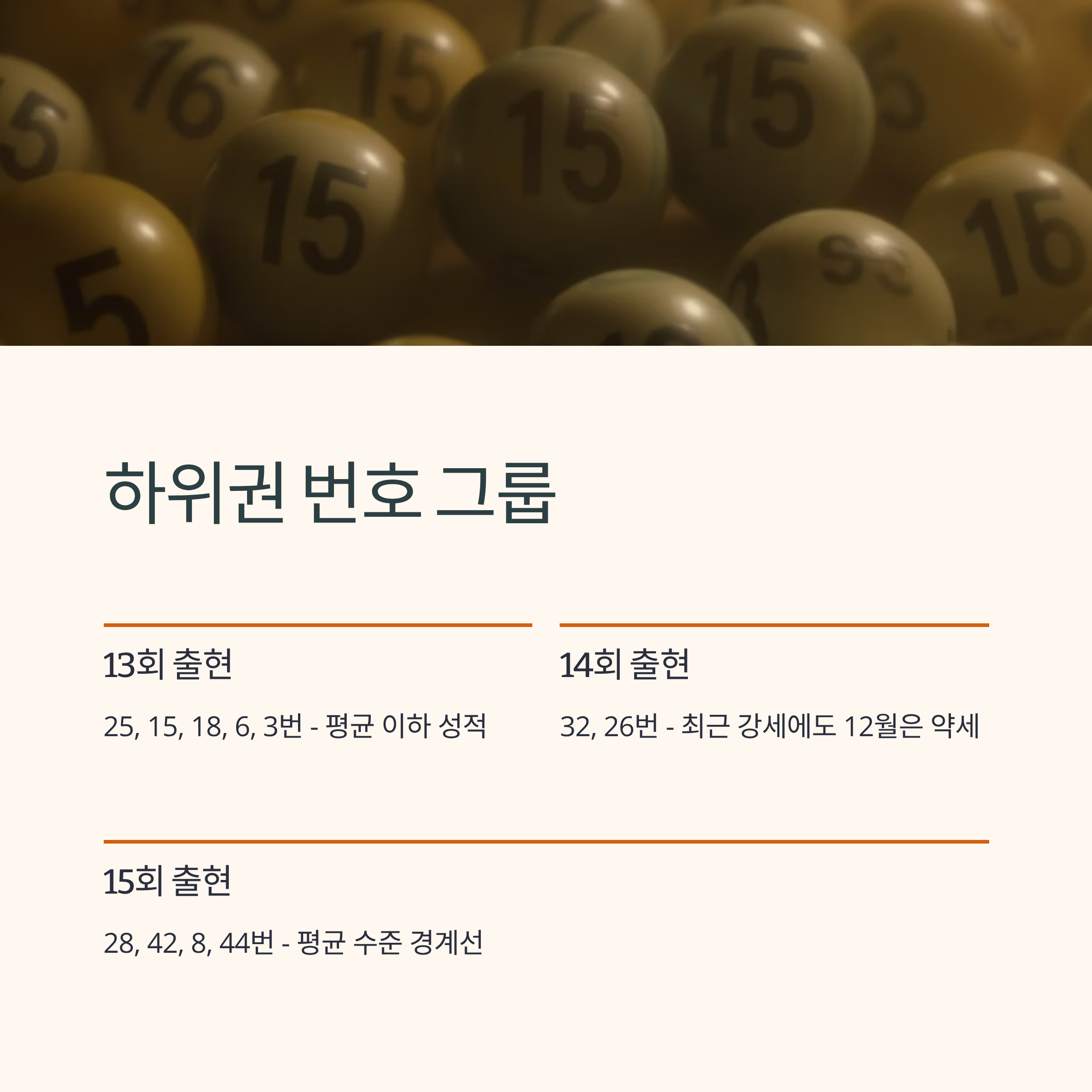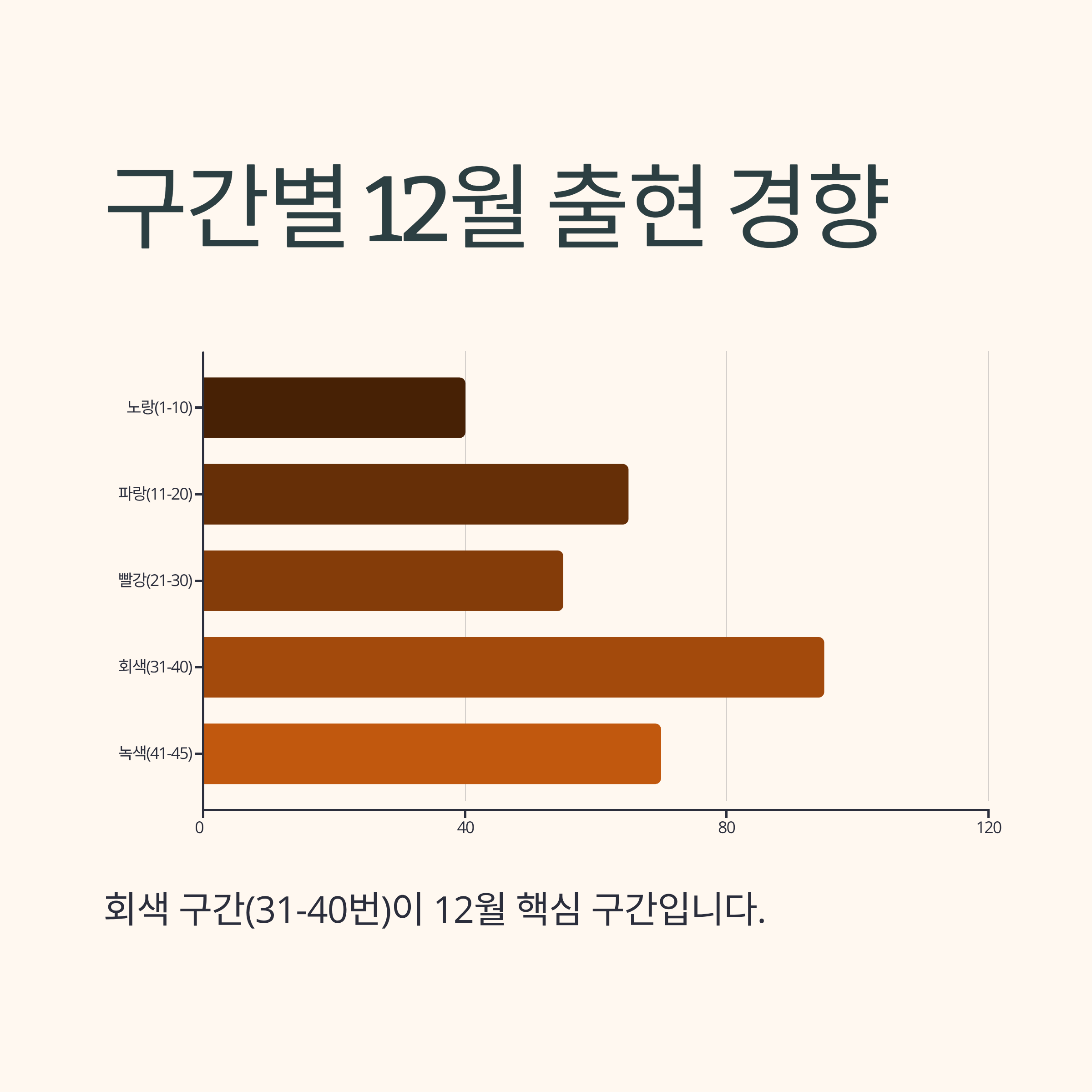 반면 42번(15회)과 44번(15회)은 약간 저조합니다. 5개 번호만 있는 구간이므로 출현 빈도 자체는 다른 구간보다 낮지만, 41번과 43번은 12월에 고려할 만한 번호입니다.
