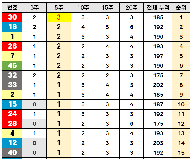 최근 5주간 당첨된 번호들을 집계하여 가장 많이 나온 순서대로 표시한 자료입니다. 이 부분은 향후 더 자세한 분석에서 설명드리겠습니다. 지금 보고 계시는 블로그를 자주 방문해 주세요.