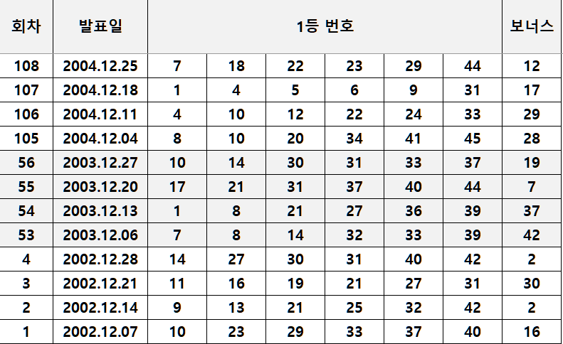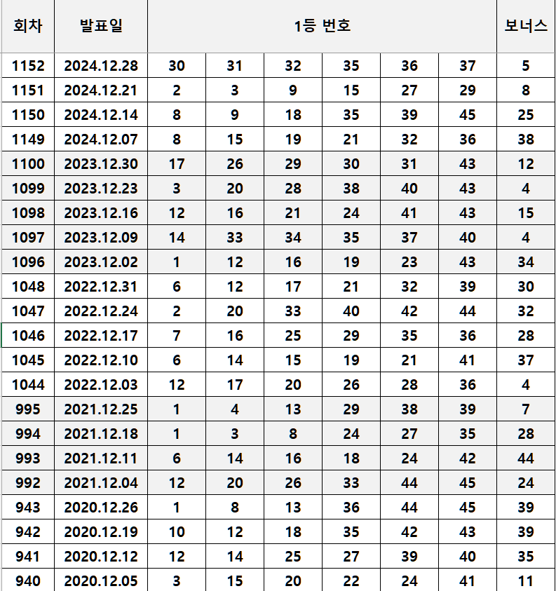 2002년 12월 7일 1회차부터 2024년 12월 28일 1152회차까지 12월에만 당첨된 로또 1등 번호와 보너스 번호 내역입니다.