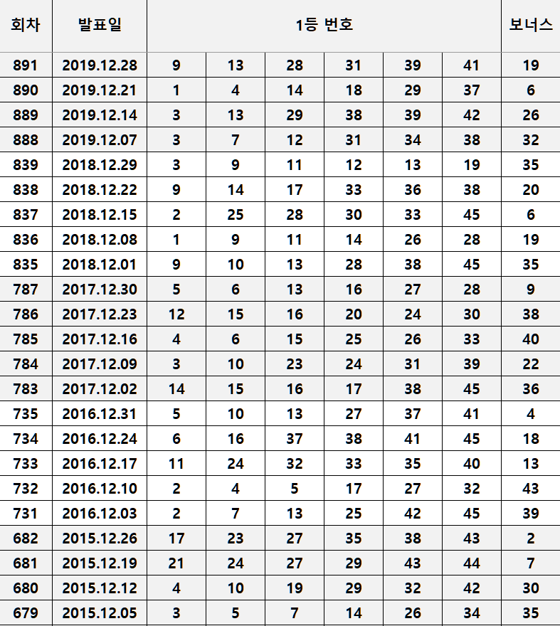 어떤 번호들이 12월에 나왔는지 직접 하나씩 보실 수 있으니, 12월 로또번호 분석하는데 도움되시길 바랍니다.