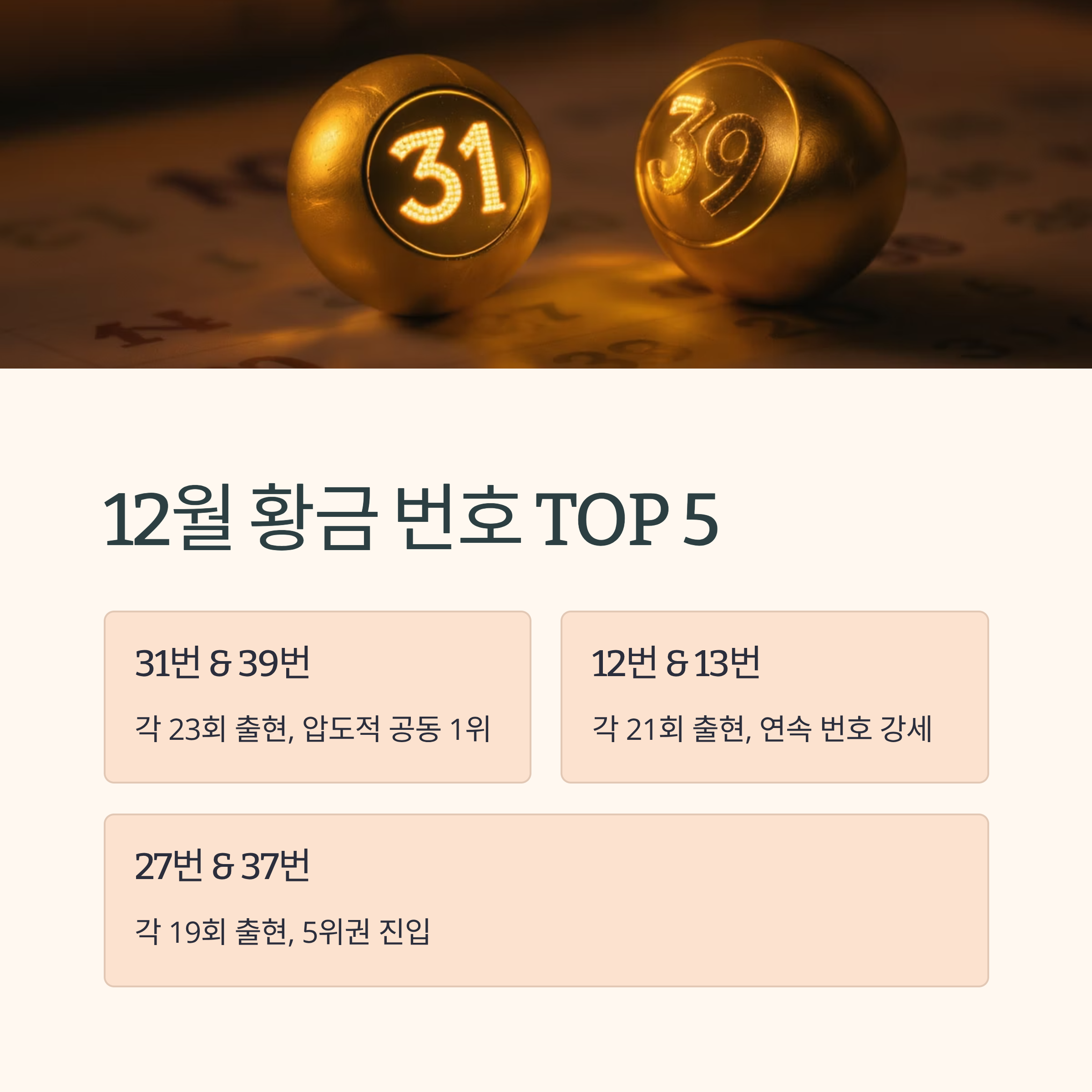 다섯 번째 번호 37번은 12월 통계 19회 출현 5위권이며, 3호기 최근 15회차에서 5회 기록했습니다. 31~40번대 강세 구간의 핵심 번호입니다.