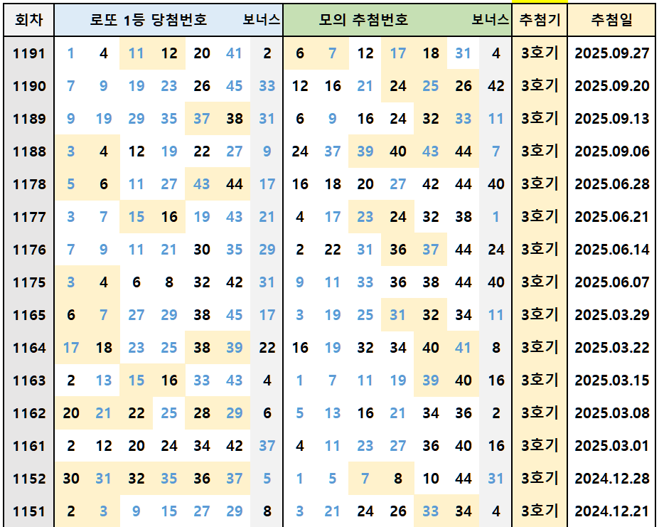 아래 데이터는 최근 3호기 추첨기에서 나온 로또 1등 당첨번호와 모의 추첨번호 15회분 내역입니다. 12월은 3호기 추첨기가 사용되기 때문에 3호기에서는 어떤 번호들이 나왔는지 분석해 보시는 것도 의미가 있습니다.