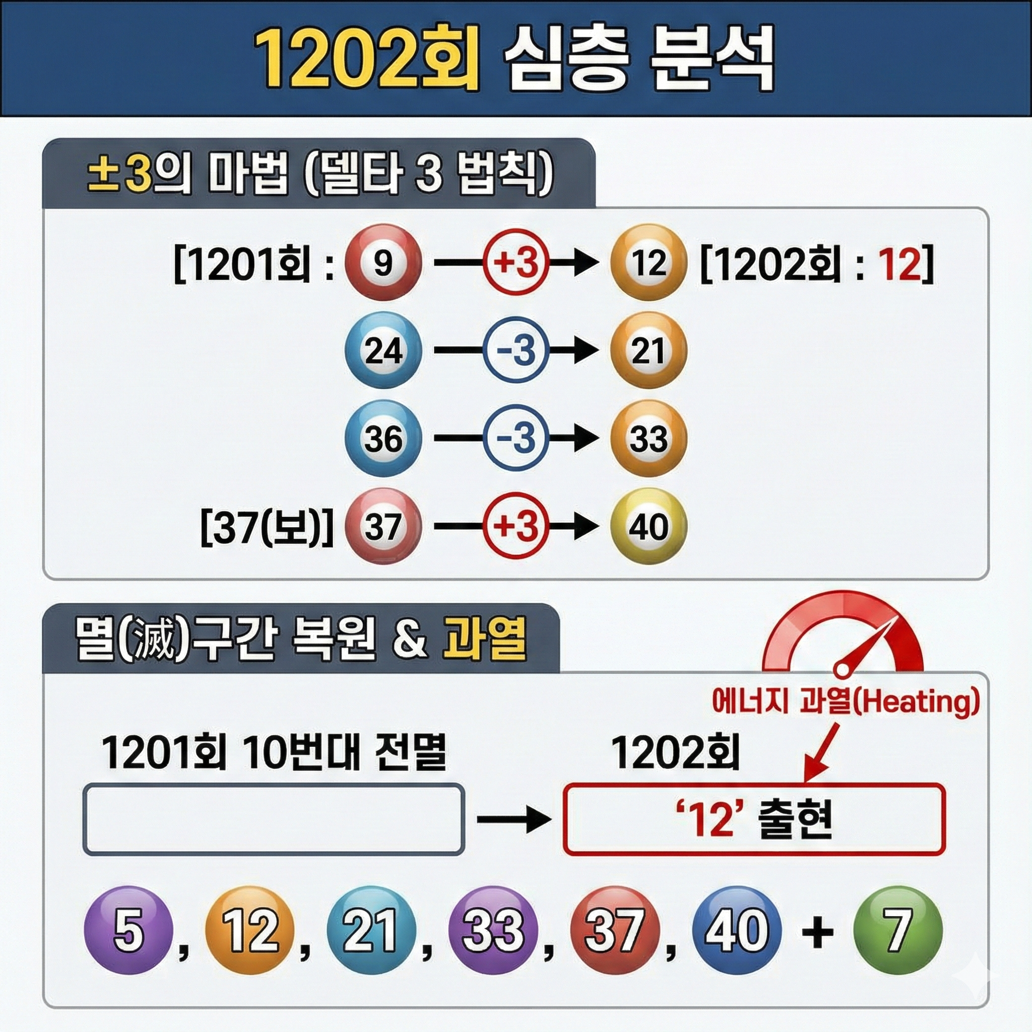 먼저 가장 눈에 띄는 부분은 ±3 델타 이동 패턴입니다. 1202회 당첨번호 중 다수는 1201회 번호에서 정확히 3만큼 이동한 숫자였습니다.