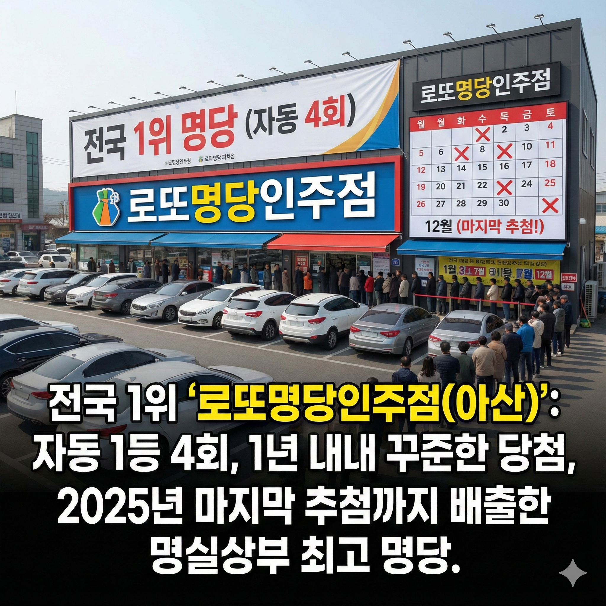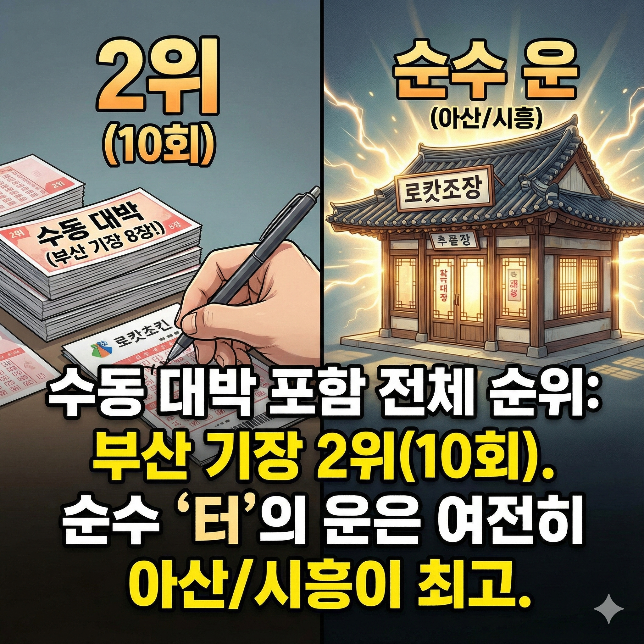 수동 대박을 빼고 순수한 '터의 운'으로만 보면, 역시 아산 로또명당인주점과 시흥 종합복권슈퍼가 2025년 최고의 명당이었습니다.