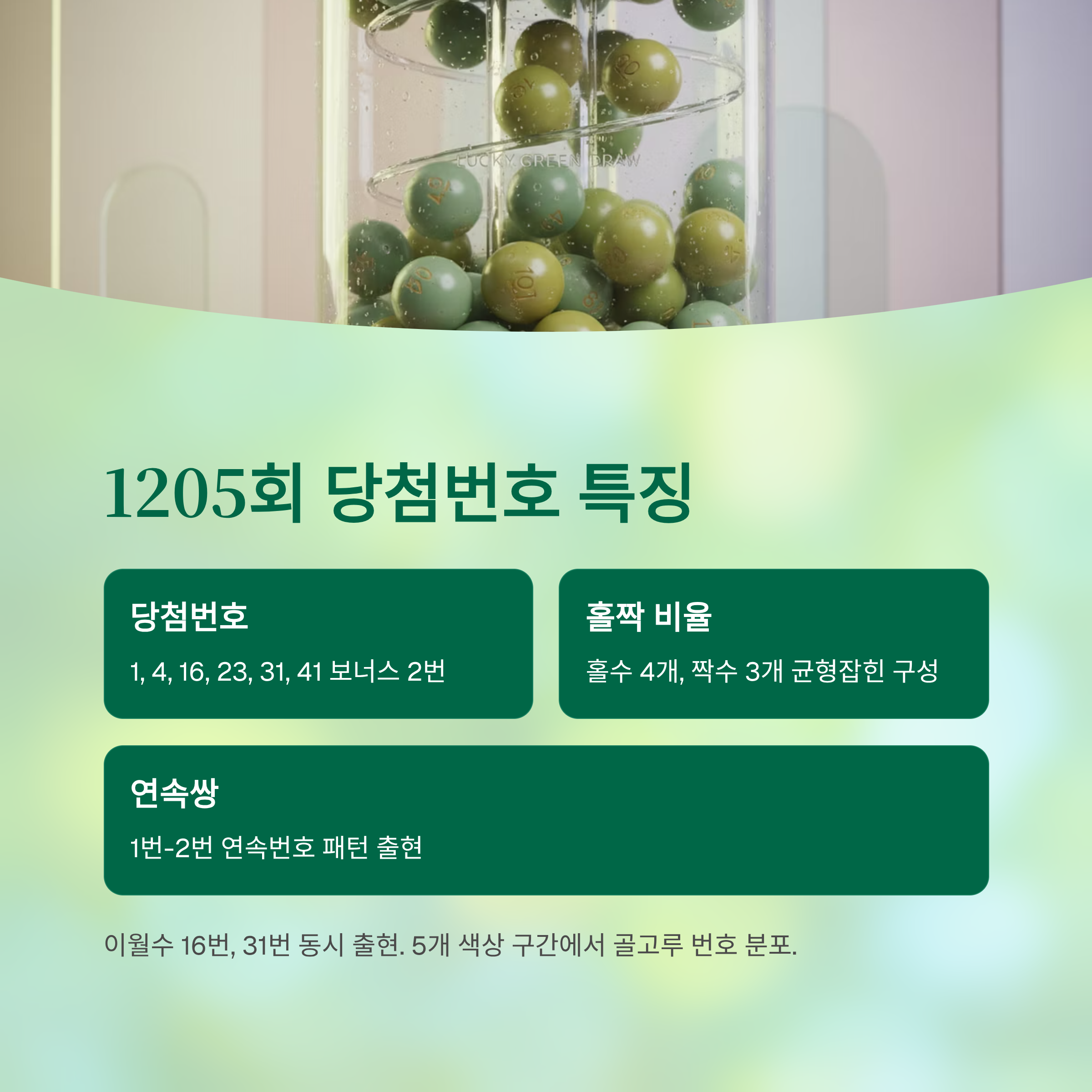 1205회 당첨번호 1, 4, 16, 23, 31, 41(보너스 2)에서 발견한 주요 특징은 다음과 같습니다. 이월수가 2개(16, 31) 포함되었고, 1월 약세 번호인 23번과 4번이 깜짝 등장했습니다. 5개 색상 구간에서 골고루 번호가 출현했으며, 연속쌍(1-2)이 형성되었습니다.