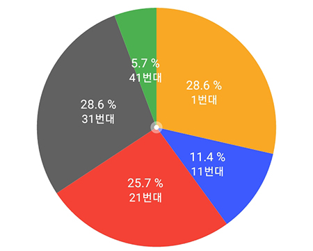 색상별 분포를 보면, 노랑색(1~10번대)에서 1번과 4번, 파랑색(11~20번대)에서 16번, 빨강색(21~30번대)에서 23번, 회색(31~40번대)에서 31번, 녹색(41~45번대)에서 41번이 나왔습니다.