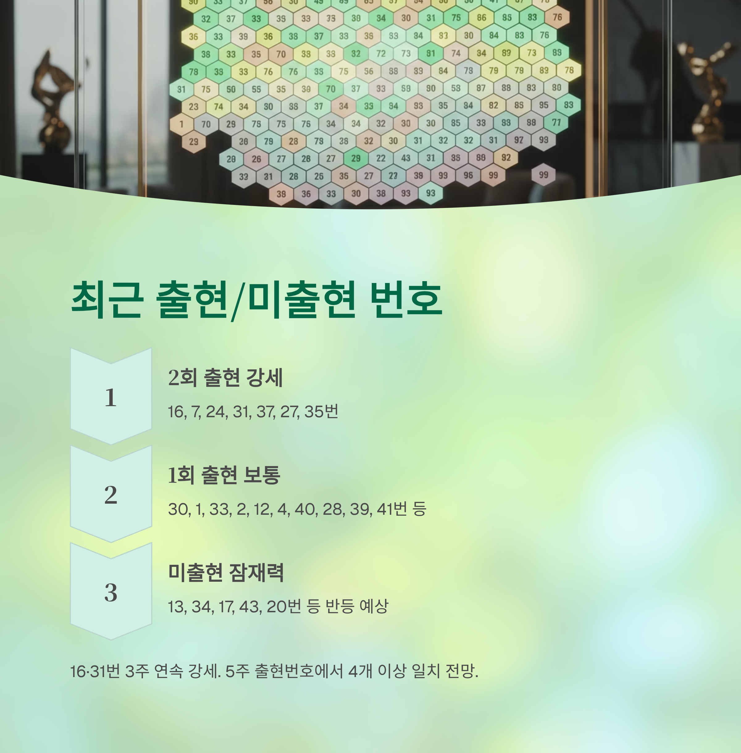 이 번호들은 최근 5주간 2회씩 당첨되어 뜨거운 수로 분류됩니다. 특히 16번과 31번은 1205회에서도 당첨되어 3주간 연속 강세를 이어가고 있습니다.