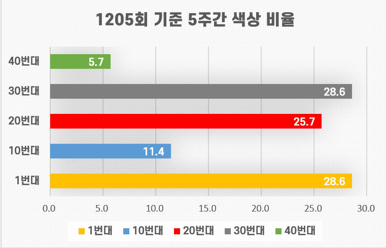 5개 색상 구간에서 골고루 번호를 선택한 균형 조합입니다. 1205회 당첨번호도 5개 구간에서 골고루 나왔으므로, 이러한 패턴이 이어질 수 있다고 판단했습니다.
