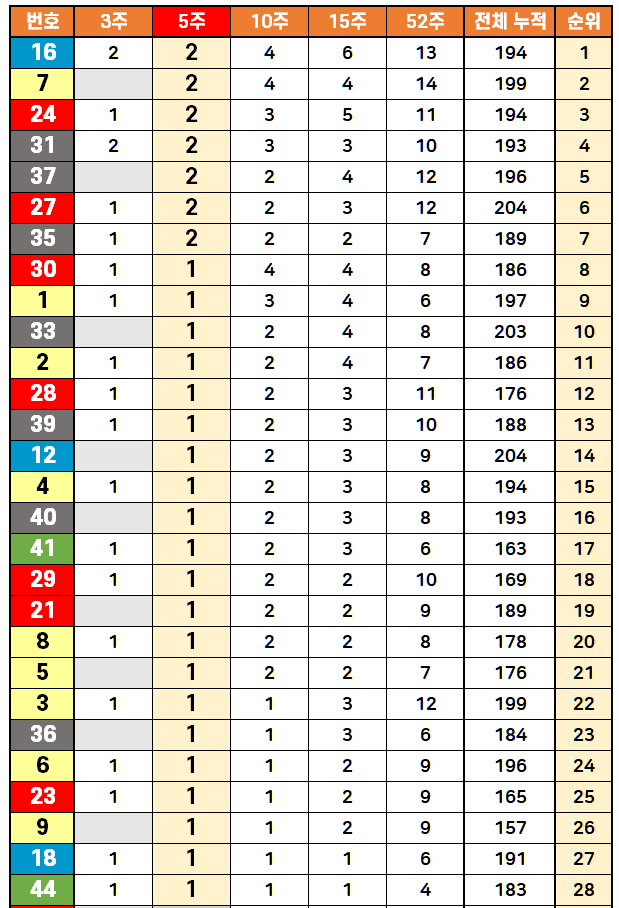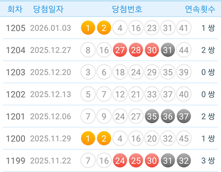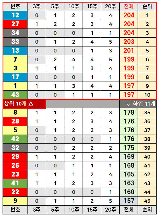 상위권 15개 번호를 당첨횟수 순으로 나열하면 12, 27, 34, 33, 13, 7, 3, 17, 1, 43, 37, 6, 20, 16, 24번입니다. 이 중에서 1번과 16번이 이번 1205회 당첨번호에 포함되었다는 점은 역대 강세 번호들의 위력을 다시 한번 보여주는 사례입니다.