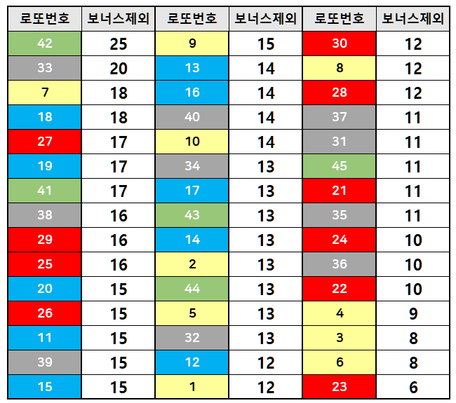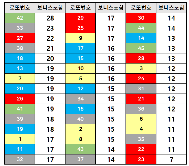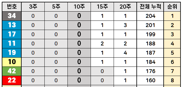 참고로 최근 10주간 미출현 번호는 11, 19, 13, 34, 17, 10, 42, 22번이고, 최근 15주간 미출현 번호는 42, 22번뿐입니다.