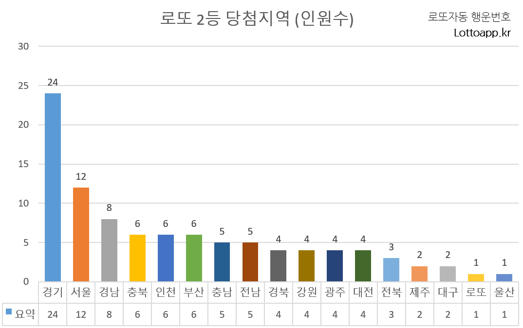 서울이 12명으로 그 뒤를 이었고, 경남에서 8명, 충북과 인천, 부산에서 각 6명씩 당첨자가 나왔습니다. 충남과 전남에서 각 5명, 경북, 강원, 광주, 대전에서 각 4명의 2등 당첨자가 배출되었습니다.