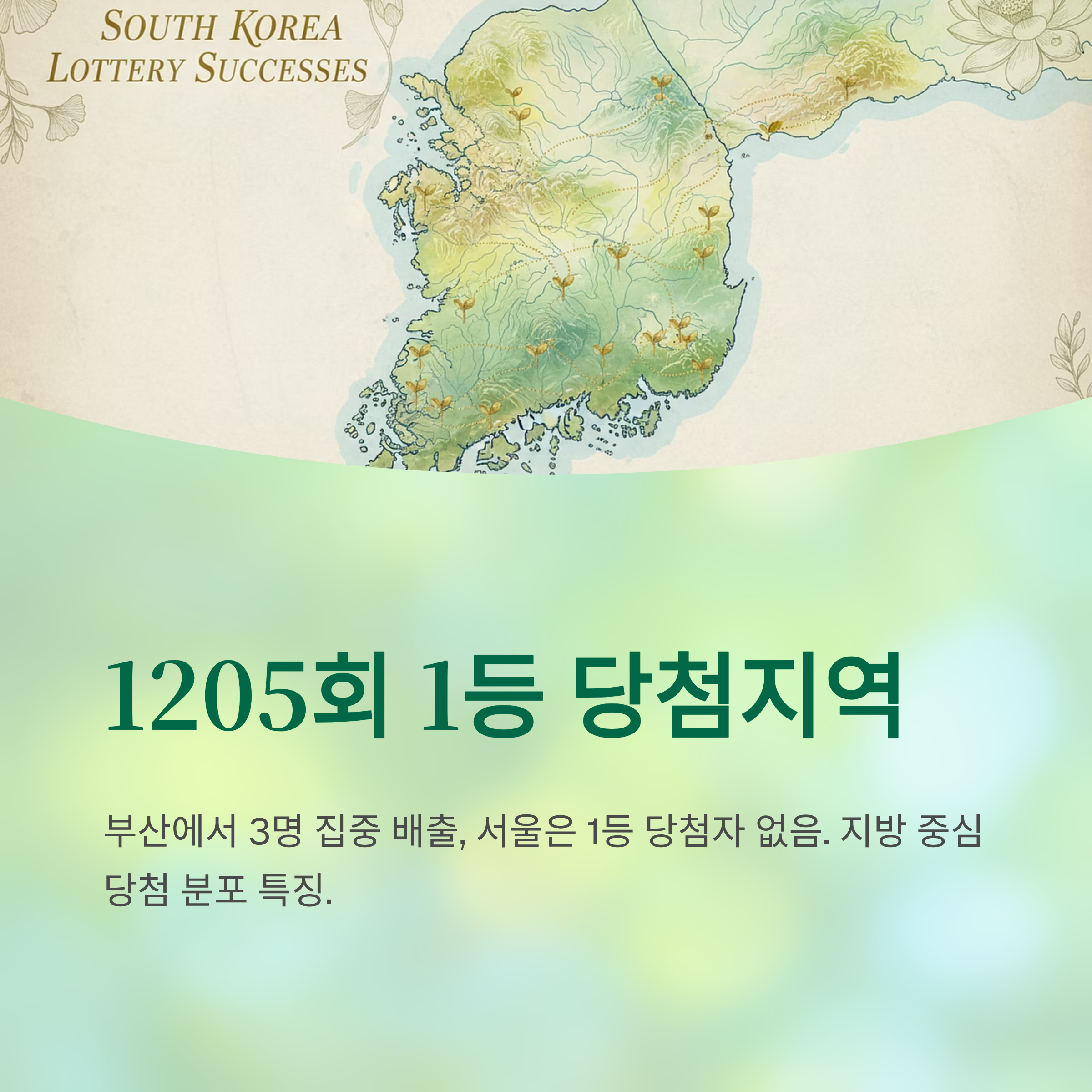 이번 1205회에서는 특이하게도 부산에서 3명의 1등 당첨자가 집중적으로 배출되었고, 서울에서는 단 한 명의 1등 당첨자도 나오지 않았습니다. 지역별 당첨 현황을 자세히 살펴보겠습니다.