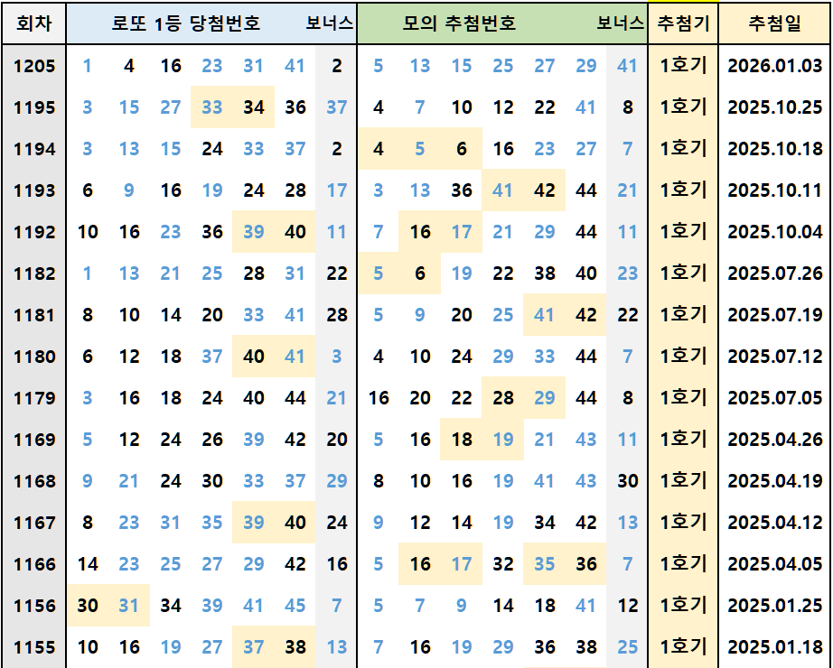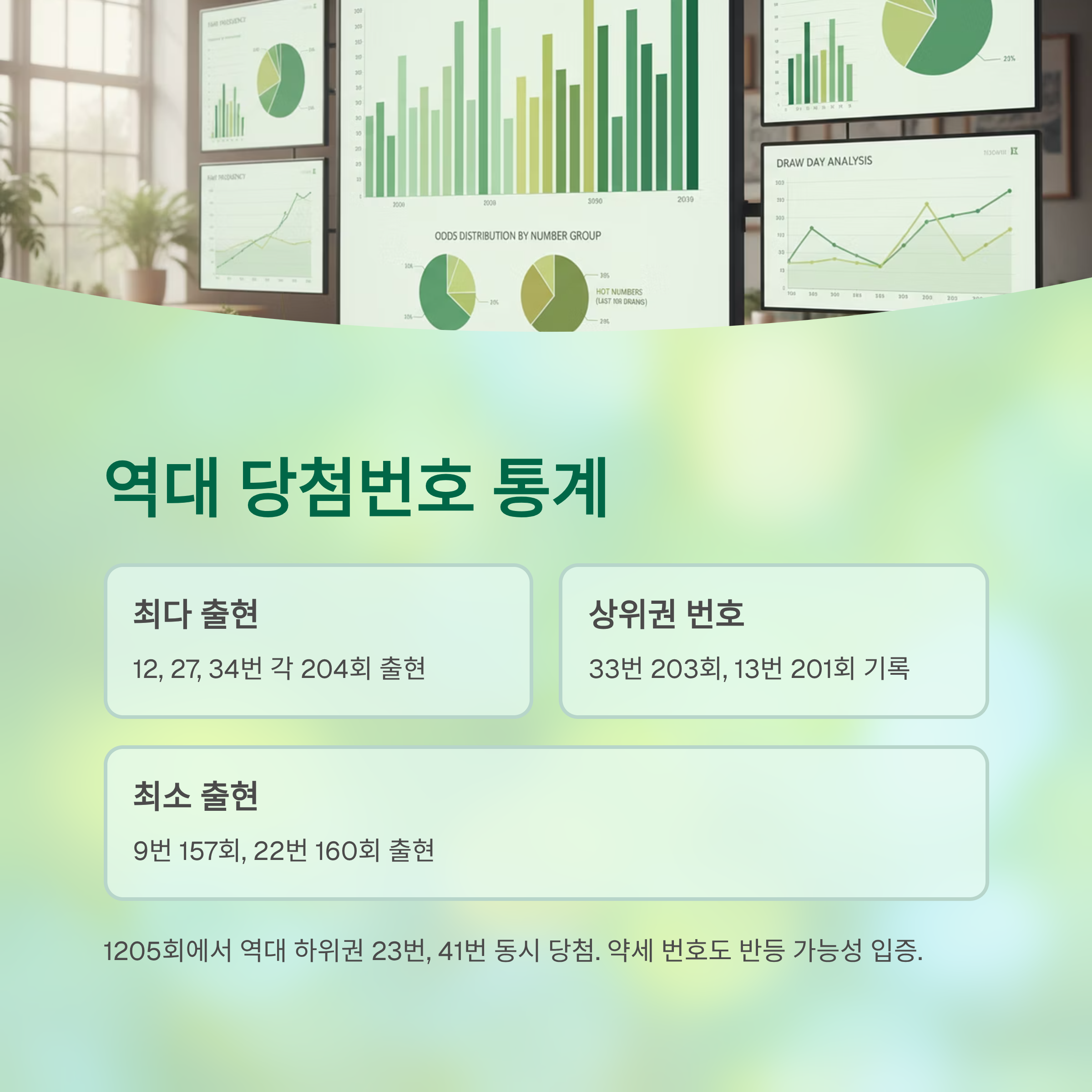 그런데 이번 1205회에서 23번과 41번이 동시에 당첨된 것은 매우 흥미로운 현상입니다. 역대 하위권 번호들이 한꺼번에 등장했다는 것은, 약세 번호들도 언제든 반등할 수 있다는 것을 보여주는 좋은 사례입니다.