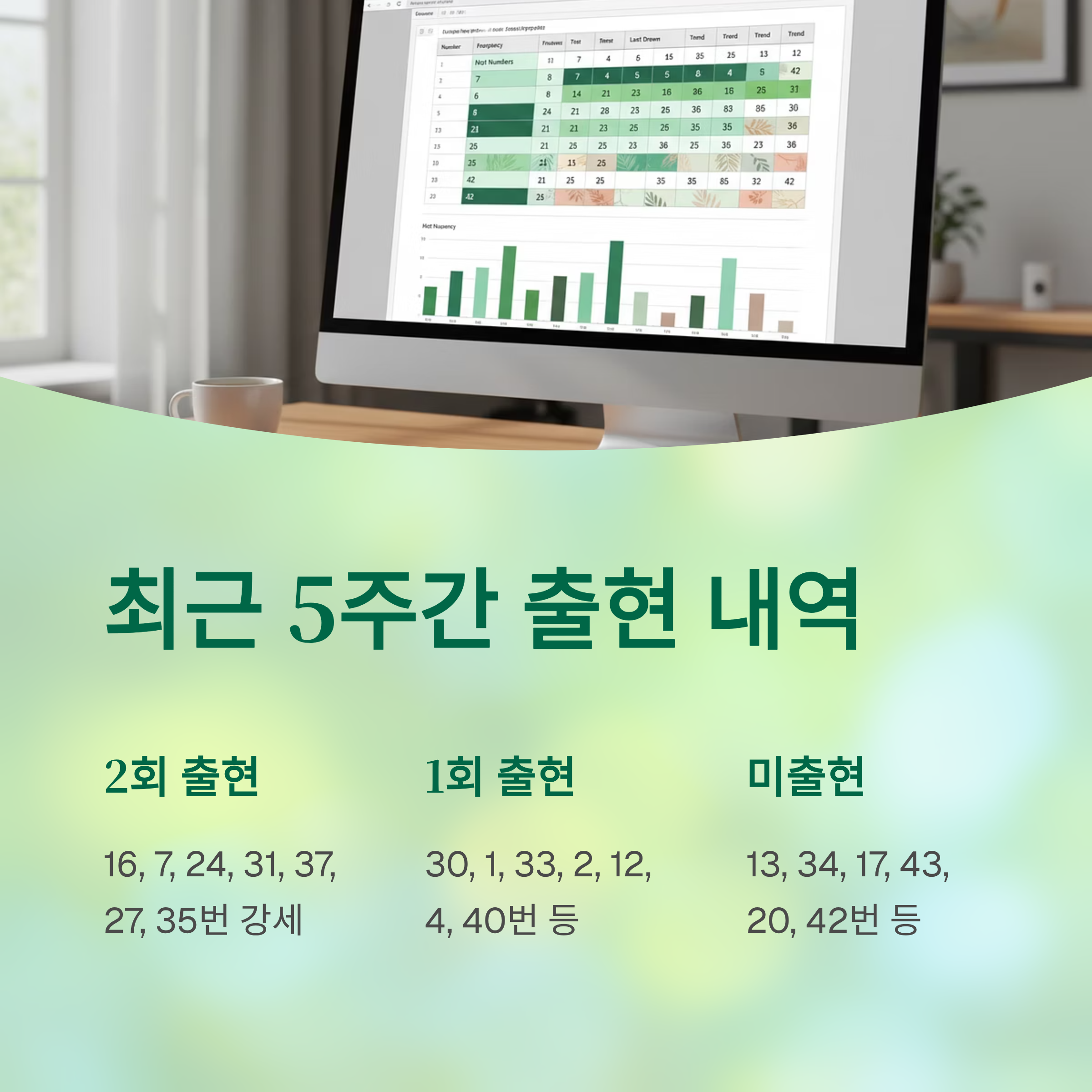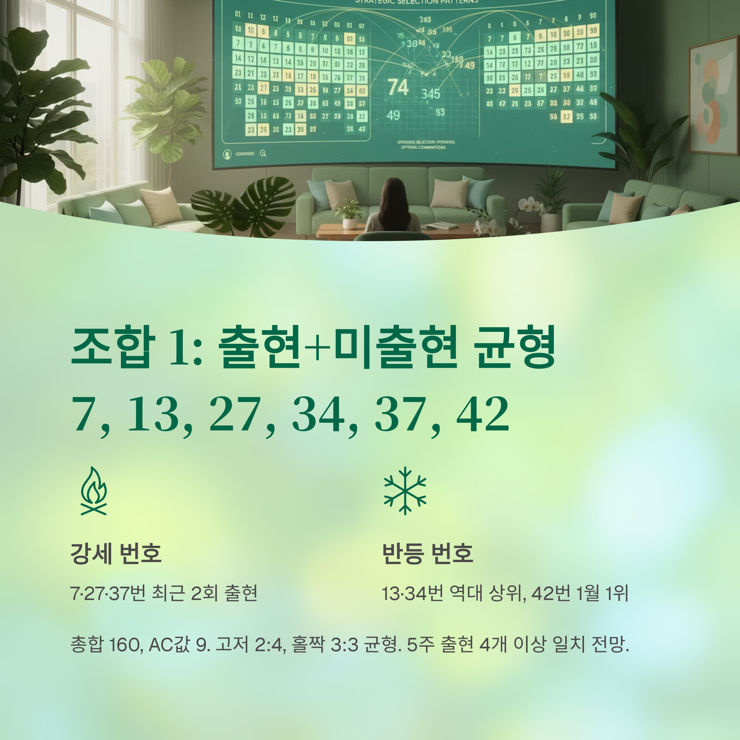 42번: 최근 15주간 미출현이지만, 1월 통계에서 28회로 압도적 1위인 번호입니다. 1월에 특히 강세를 보이는 번호로, 반등 시점이 다가왔다고 판단됩니다.