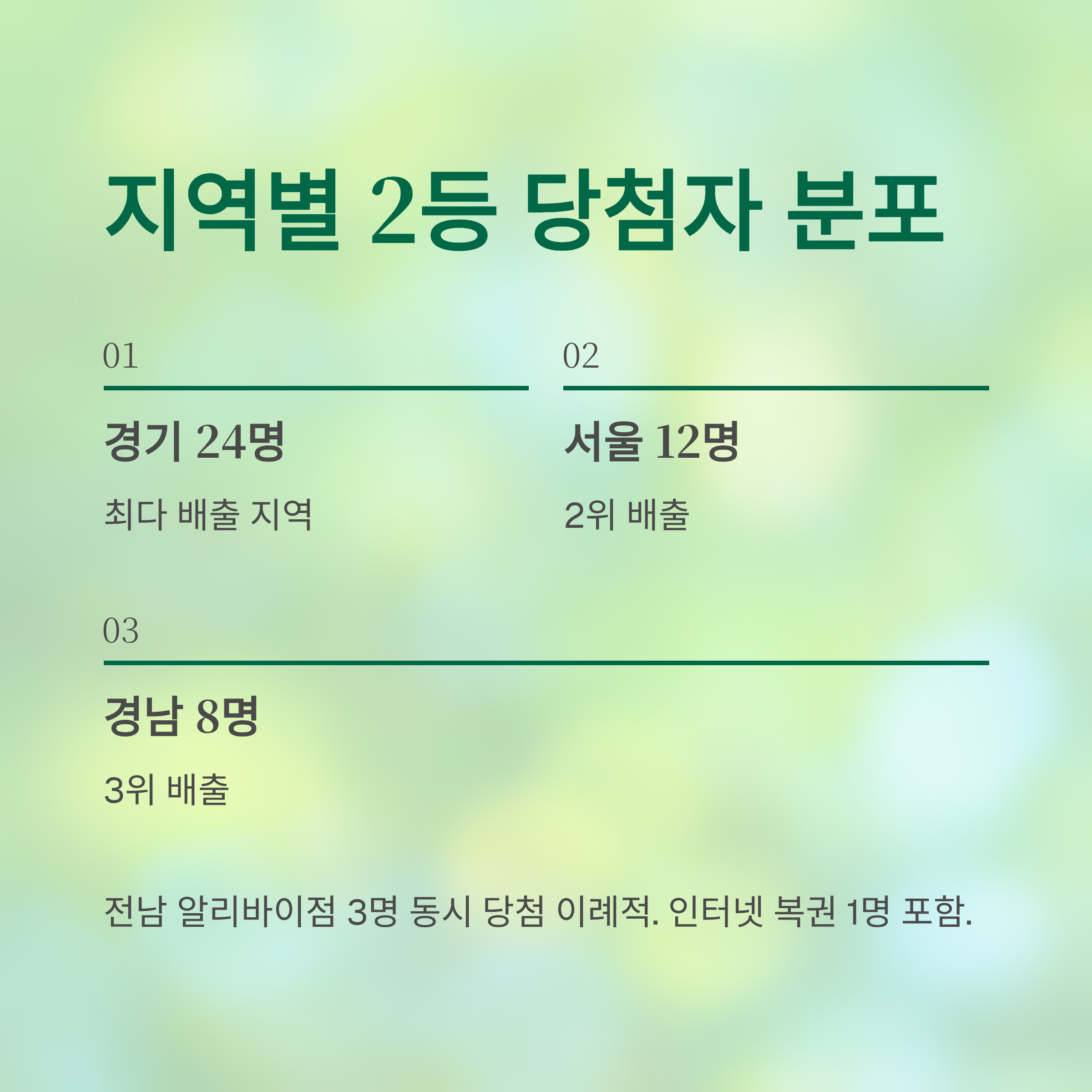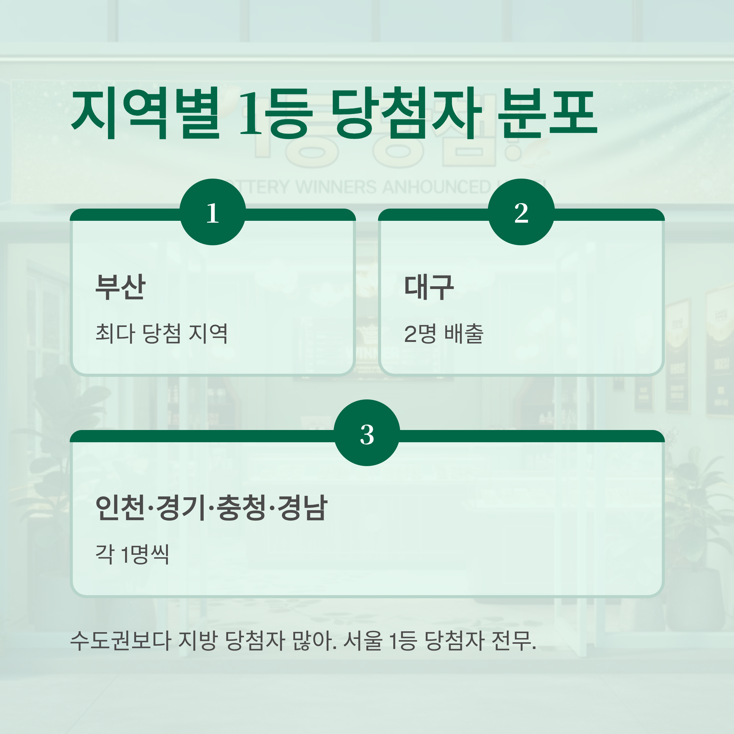 이번 회차의 특징은 수도권보다 지방에서 더 많은 당첨자가 나왔다는 점입니다. 서울에서는 1등 당첨자가 한 명도 나오지 않았는데, 이는 매주 당첨 지역이 어떻게 바뀔지 예측하기 어렵다는 것을 잘 보여줍니다.